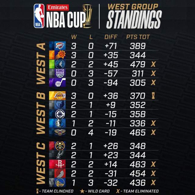 西部这边雷霆和太阳3胜0负最后一轮直接对话,赢球一队小组第一,输球一方也有机会拿到外卡资格,同组的森林狼、国王、爵士均出局。